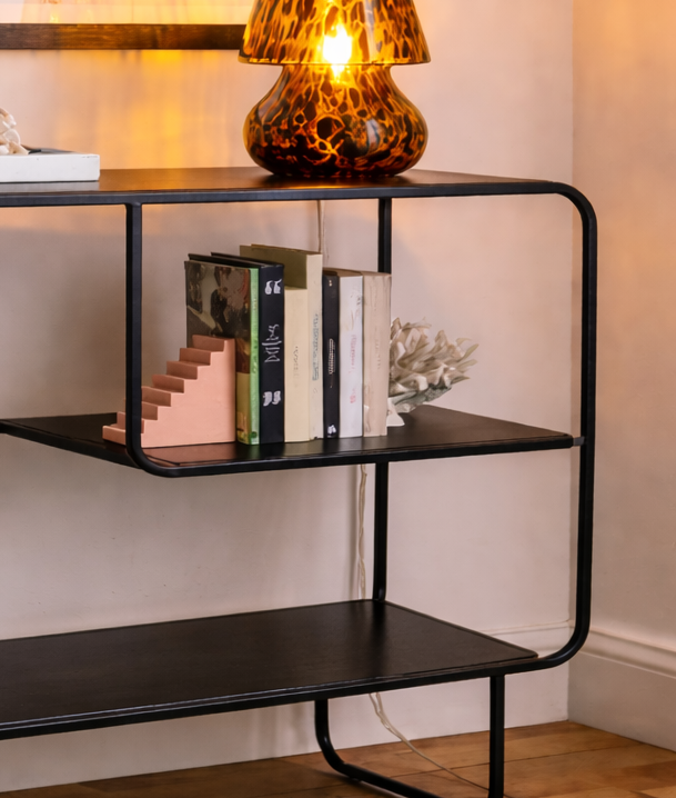 Diseño moderno con estructura metálica negra, perfecta para aportar estilo a espacios contemporáneos. Su formato abierto permite organizar libros y objetos decorativos de forma equilibrada, combinando funcionalidad y estética en un solo mueble.