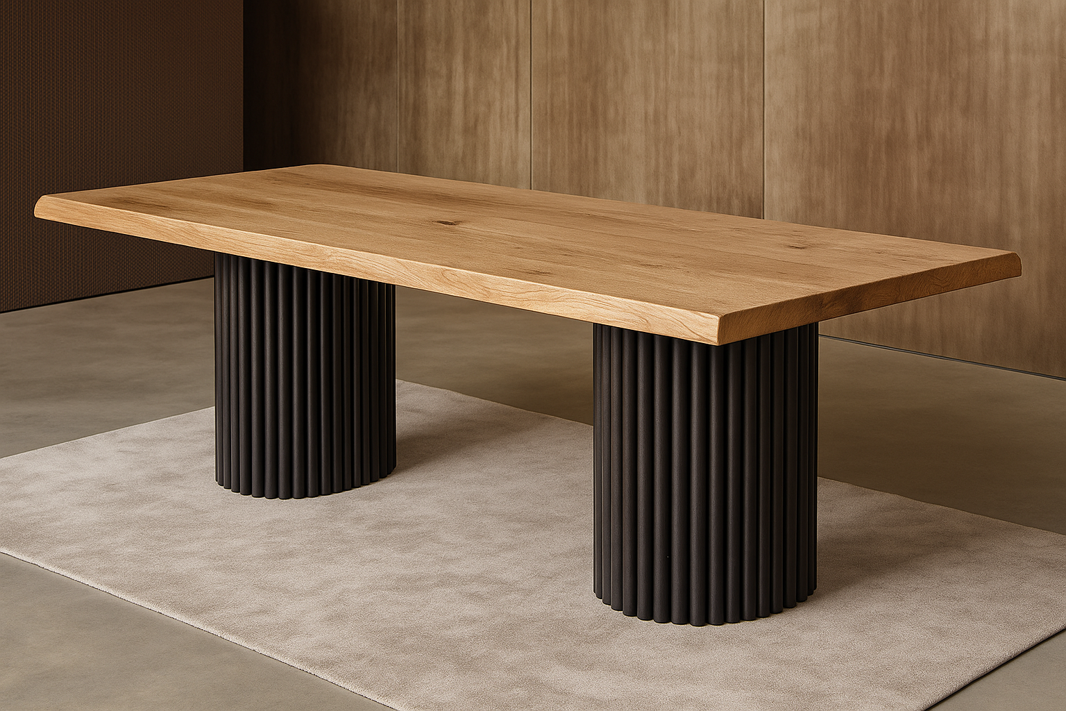 Su cubierta de bordes naturales realza las vetas únicas de la madera, mientras que sus bases cilíndricas acanaladas en fierro negro aportan un carácter sofisticado y contemporáneo.